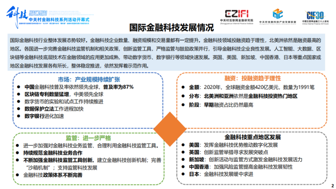 国际金融科技行业整体发展态势较好。金融科技企业数量、融资规模和交易量都有一定提升。金融科技领域投融资趋于理性,北美洲依然是融资最高的地区。各国进一步完善金融科技监管机制和相关政策,创新监管工具,严格监管与鼓励政策并行,引导金融科技企业良性发展。人工智能、大数据、区块链等金融科技底层技术在金融领域的应用更加成熟,带动数字货币、数字银行等领域快速发展。英国、美国、新加坡、中国香港、日本等重点国家或地区金融科技发展各有所长,整体稳定推进,依然发挥着示范作用。