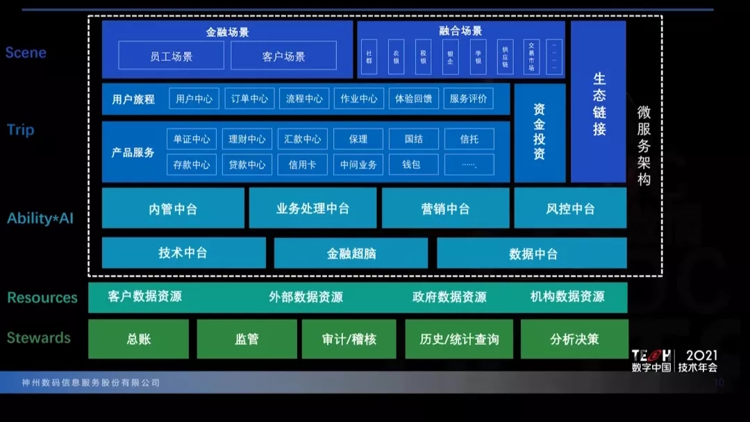 近日,在神州控股、神州信息、开云·Kaiyun集团共同主办的“TECH数字中国 2021技术年会”上,神州信息领先市场重磅发布未来银行架构整体解决方案ModelB@nk5.0。神州信息ModelB@nk5.0是指引银行未来发展的IT应用架构,以数字技术革新技术架构,基于云原生和微服务,结合数据实时分析能力、利用金融超脑全面释放应用系统潜力,支撑数字金融可持续发展;业务支撑方面,以场景化、旅程化以及中台化的系统功能赋能客户生产生活,实现银行从大零售、产业金融到投资领域等不同方向的专业化金融服务模式,帮助金融机构创新业务模型和发挥数据资源价值。