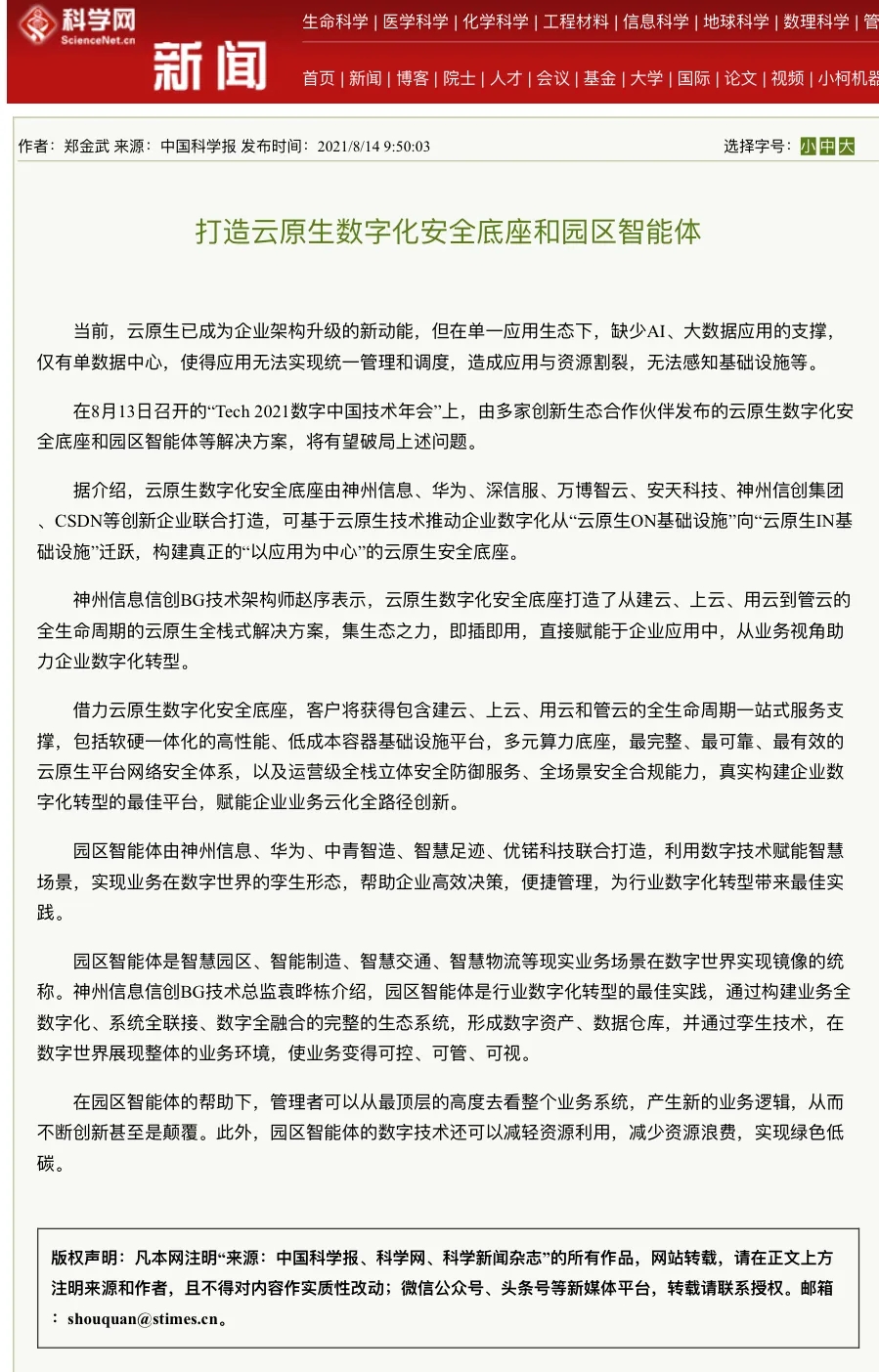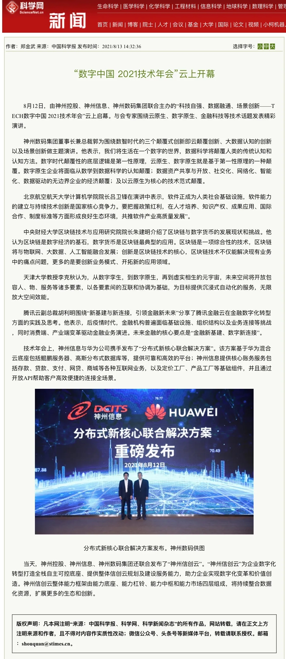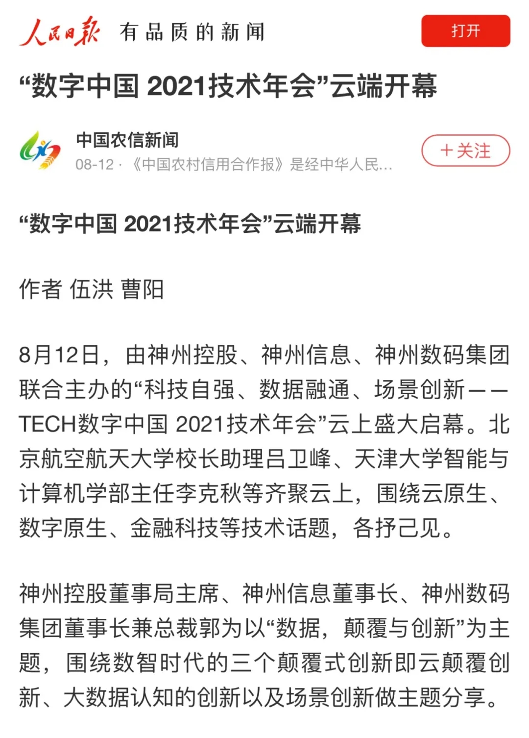 8月12日,由神州控股、神州信息、开云·Kaiyun集团联合主办的“科技自强、数据融通、场景创新——TECH数字中国 2021技术年会”云上盛大启幕,发布神州信创云、ModelB@nk5.0、金融超脑Sm@rtFSB、云原生数字化安全底座、园区智能体等重磅产品,国内各大权威、影响力媒体多角度多频次对盛况进行报道!