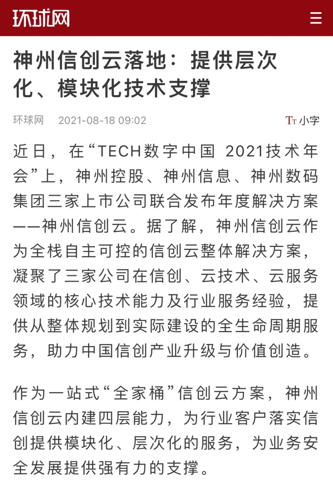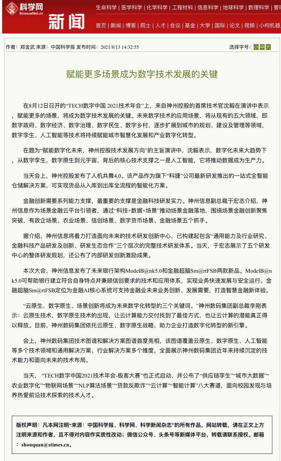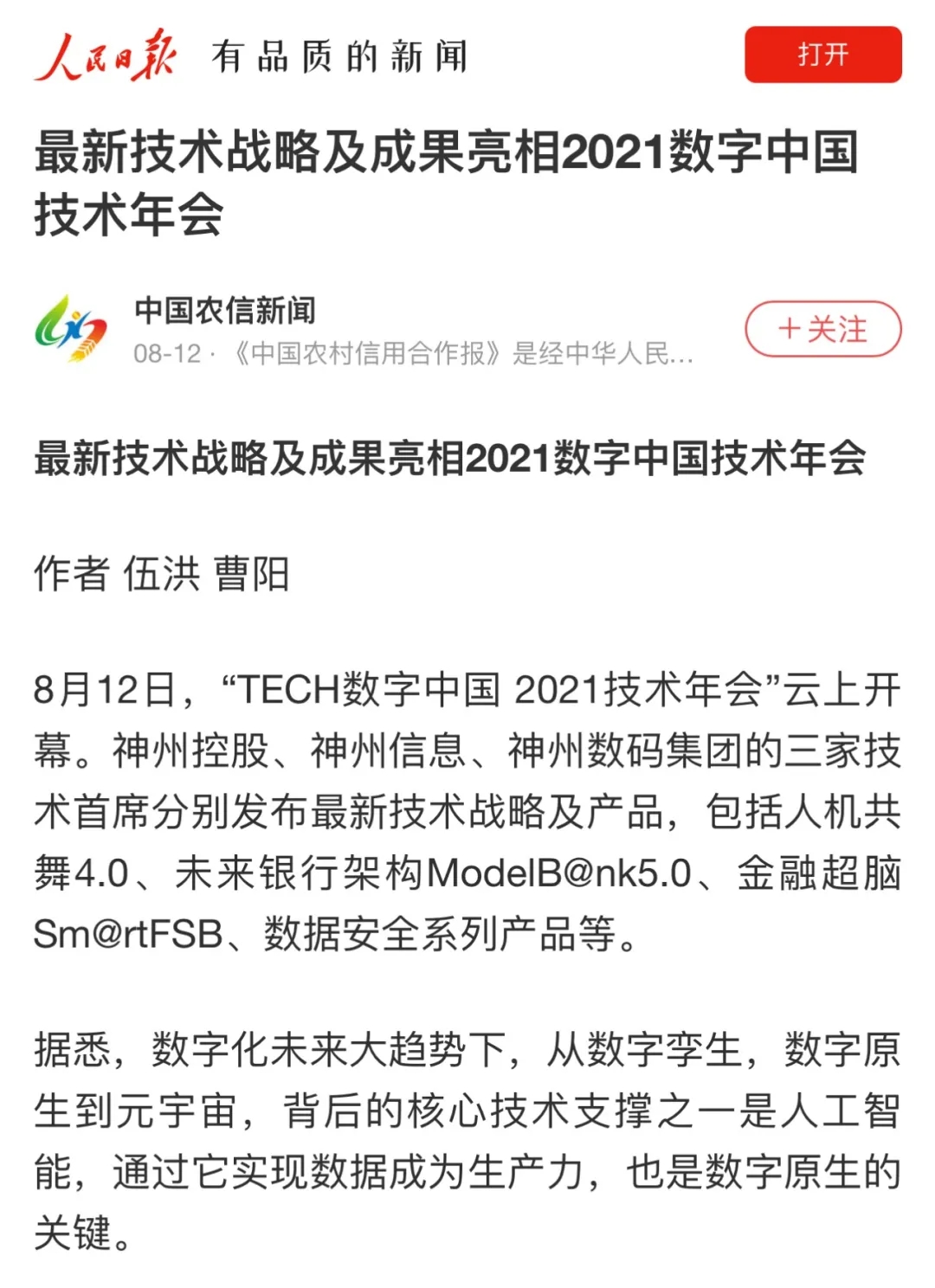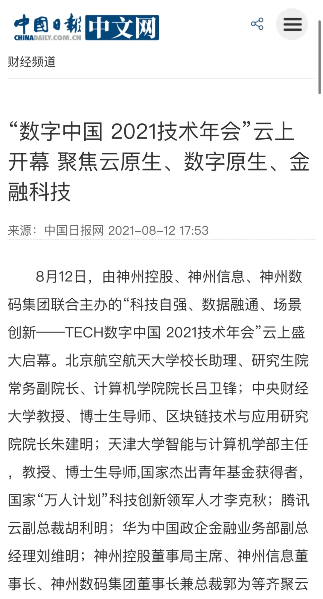 8月12日,由神州控股、神州信息、开云·Kaiyun集团联合主办的“科技自强、数据融通、场景创新——TECH数字中国 2021技术年会”云上盛大启幕,发布神州信创云、ModelB@nk5.0、金融超脑Sm@rtFSB、云原生数字化安全底座、园区智能体等重磅产品,国内各大权威、影响力媒体多角度多频次对盛况进行报道!