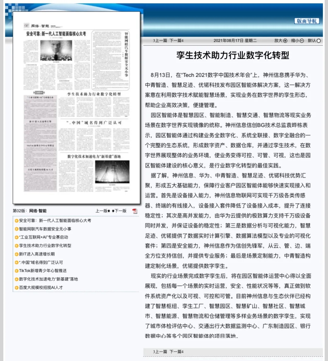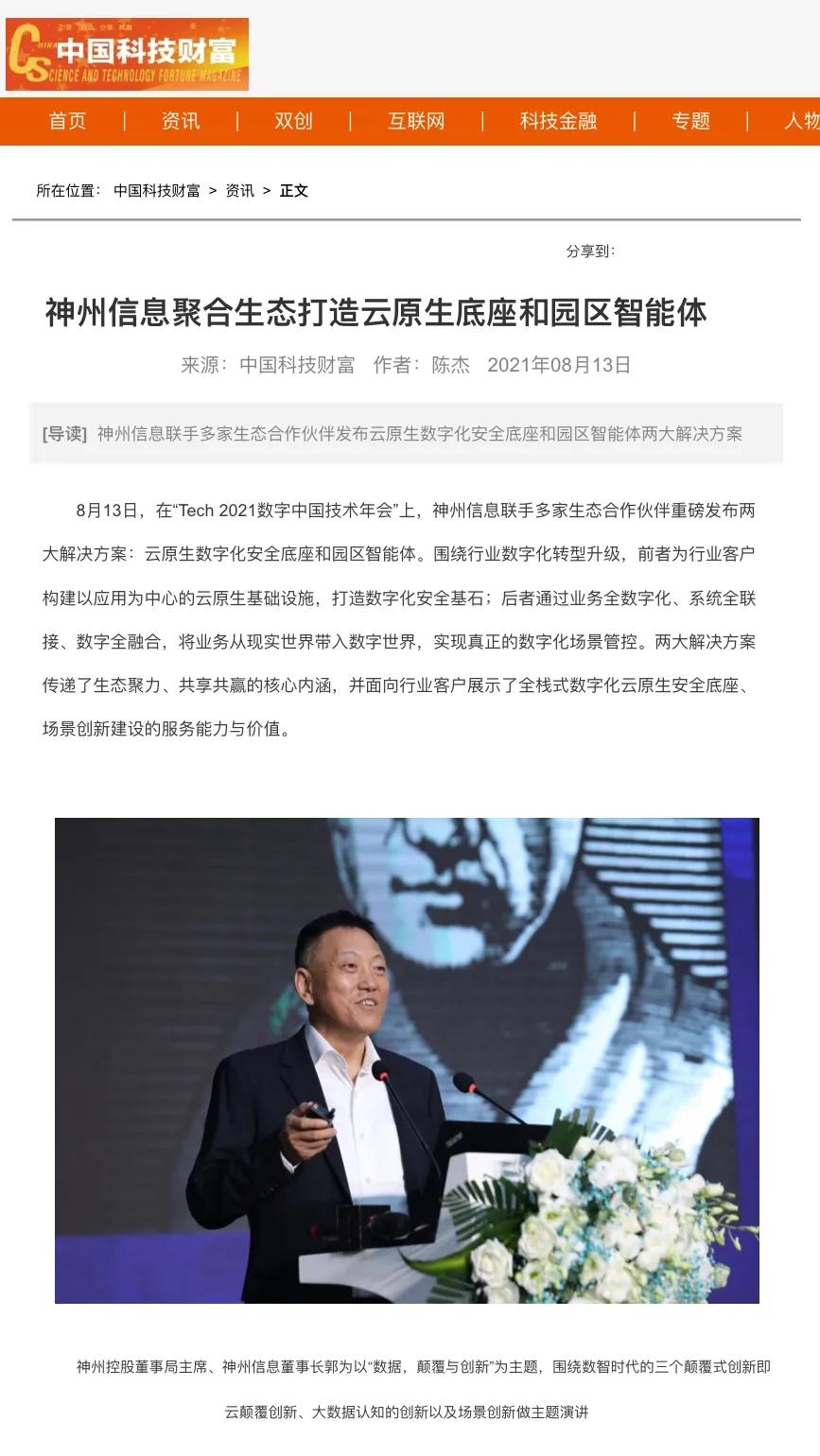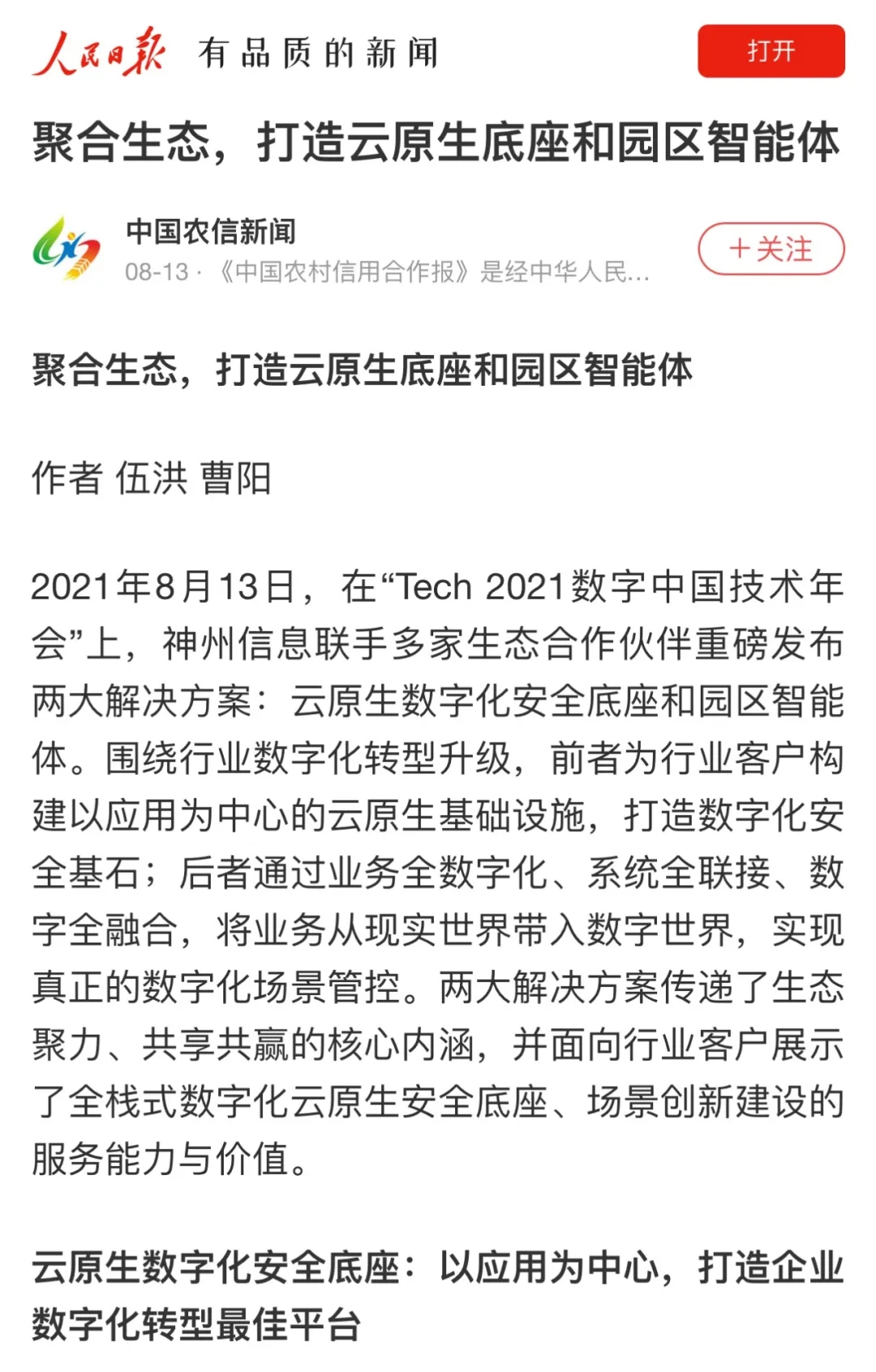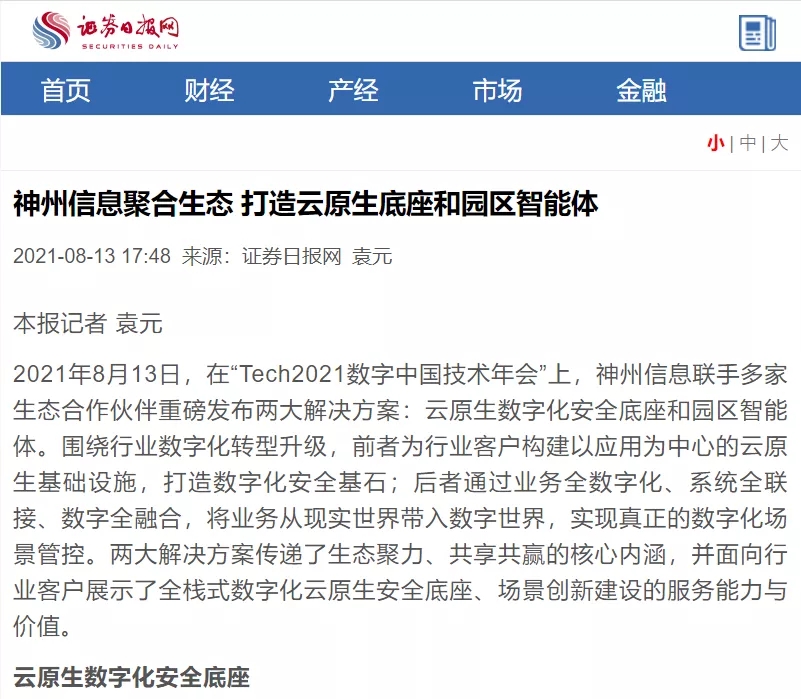 8月12日,由神州控股、神州信息、开云·Kaiyun集团联合主办的“科技自强、数据融通、场景创新——TECH数字中国 2021技术年会”云上盛大启幕,发布神州信创云、ModelB@nk5.0、金融超脑Sm@rtFSB、云原生数字化安全底座、园区智能体等重磅产品,国内各大权威、影响力媒体多角度多频次对盛况进行报道!